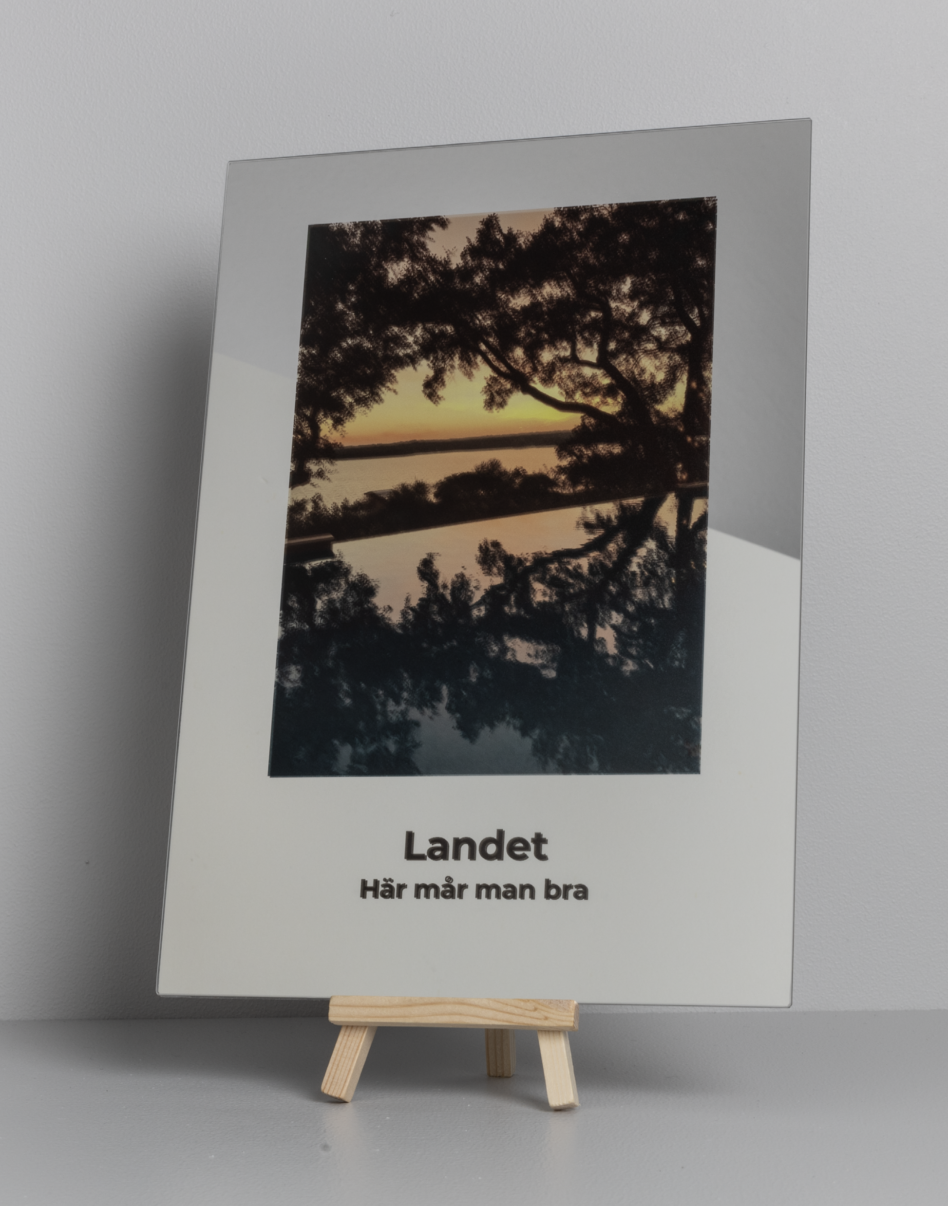 Du väljer själv vilken bild, text och namn du vill ha till din spegel. Vi rekommenderar att bifoga bilderna i högsta möjliga kvalité för att kunden ska bli så nöjd som möjligt. Med den reflekterande ytan och eftersom vit färg inte trycks får du en extra cool och designad spegel.